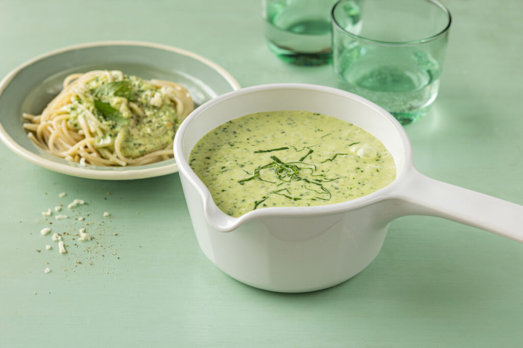 Landfrau Monika Flury empfiehlt ihre würzige und cremige Bärlauchsauce aus Bärlauch, Zitrone und Rahm zu Spaghetti, gebratenem Fleisch oder auch zu Fisch.