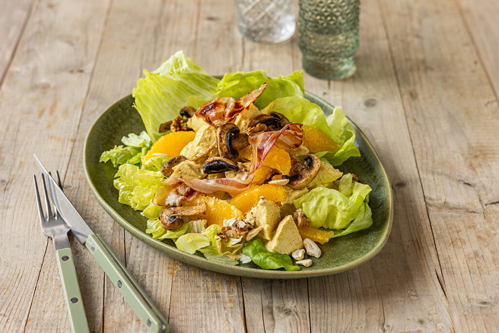 Landfrau Judith Piller-Dietrich empfiehlt ihren raffinierten Pouletsalat an würziger Currysauce: mit Orangen, knusprigen Specktranchen, Champignons und Nüssen.
